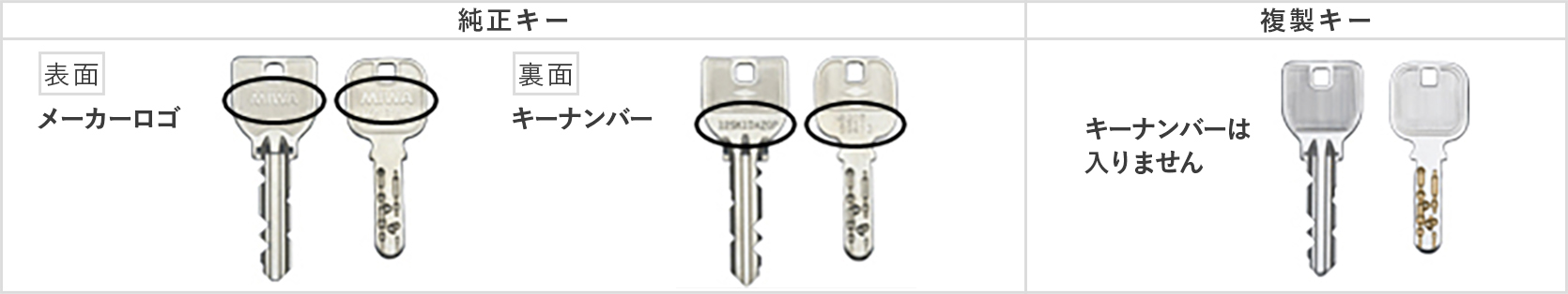 純正キーは、キーヘッド(鍵を摘まむ部分)にメーカー名(例:MIWA)と数字とアルファベットから成る10桁ほどのキーナンバーが刻印されており、そのキーナンバーをもとに、錠前メーカーの工場で製作されます。製作日数はややかかりますが、高精度でシリンダー構造を痛めにくいことから、メーカーに推奨されています。一方でキーナンバーには物件情報が登録されている場合もあり、他人に知られないようにするなど取り扱いには注意が必要です。